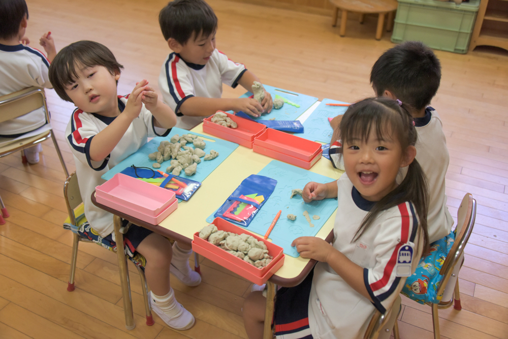 外遊びも毎日元気いっぱいにしていますが、部屋遊びも好きな子どもたち。粘土で好きな形を作ったり、自由帳に思い思いの絵を描いたりと、楽しんでいます。 年少さんもフルーツバスケットなど、ルールがある遊びにも挑戦しています☆