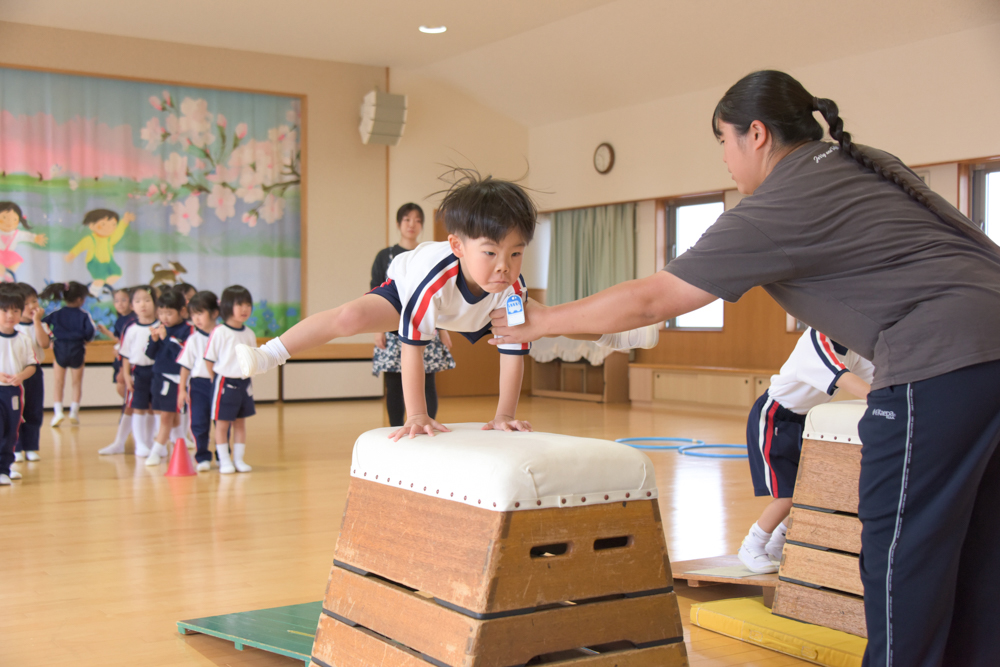 年中さんは正課体操でとび箱に挑戦しました。 しっかり足を伸ばして跳ぶ姿が、とてもかっこよかったです!