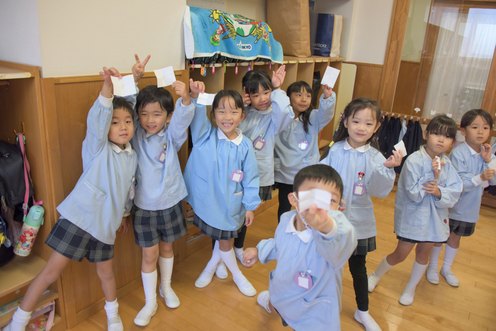 節分が日曜日なので、ちょっと前倒しで豆まきをしました。 今年は怖くて泣いちゃう子も少なく、みんな元気よく 「おにはーそと!」と豆をまけました☆ 鬼に捕まりそうなクラスの友だちを皆で助けに行ったり、クラスの絆を感じられました。