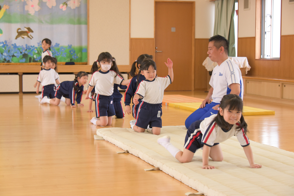 体操の前は元気に挨拶! 年長さん達はいま後ろ回りに挑戦中です。 年少さん達も15日の参観に向けて、行進や体操の練習をがんばっています☆