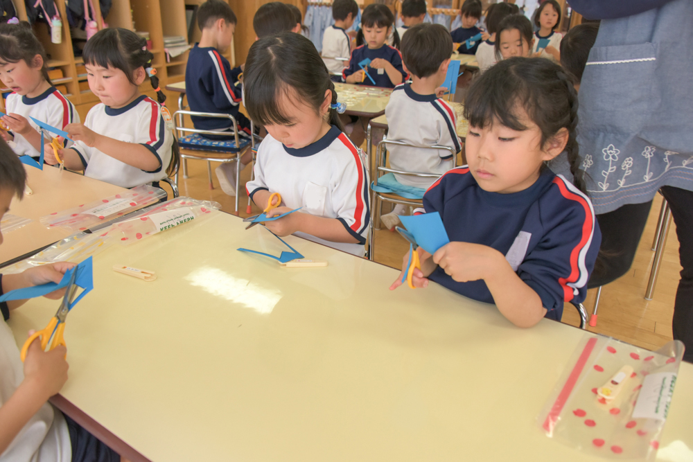 年少さん達も、もうすぐ進級ですね。 制作の時には、ぐっと集中して取り組む姿が見られます。 はさみやのり、マーカーなどの使い方も上手になり、「できたよ!」と嬉しそうに見せてくれる姿が微笑ましいです☆
