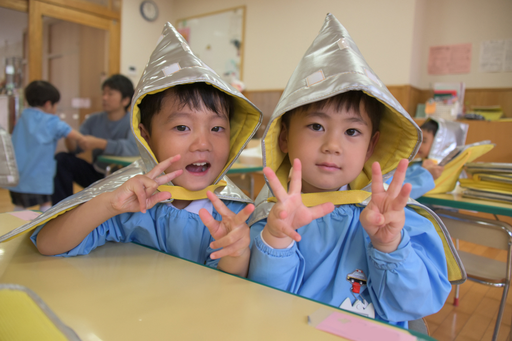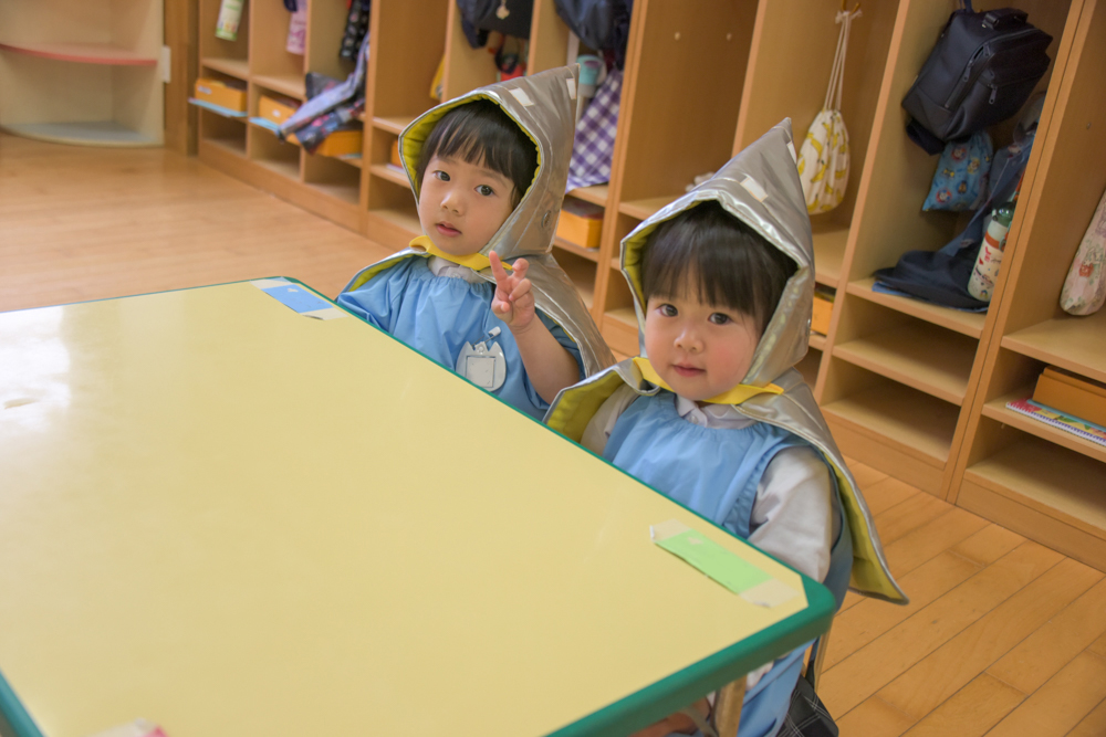 年少さんは初めての防災頭巾かぶりに苦戦しながらも、頑張って被っていました☆