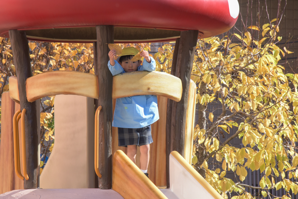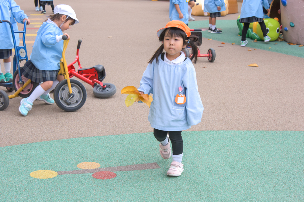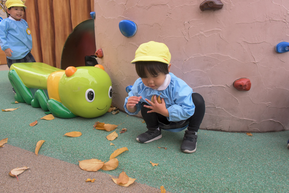落ち葉が目立つ季節になってきましたね。 幼稚園の園庭にもたくさんの落ち葉があるので、子どもたちはその落ち葉をさまざまなものに見立てて、楽しそうに遊んでいます☆
